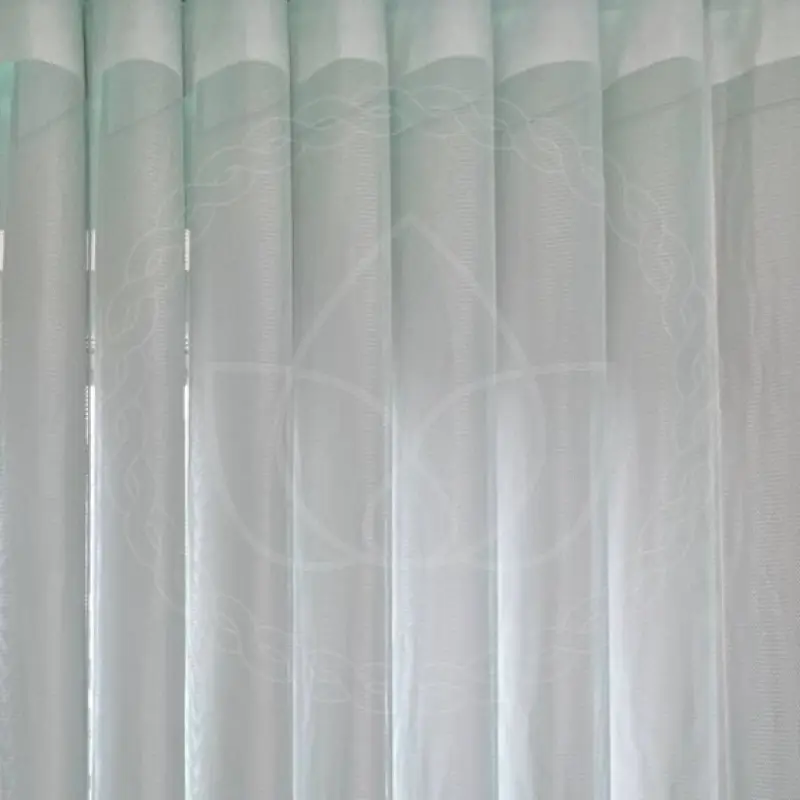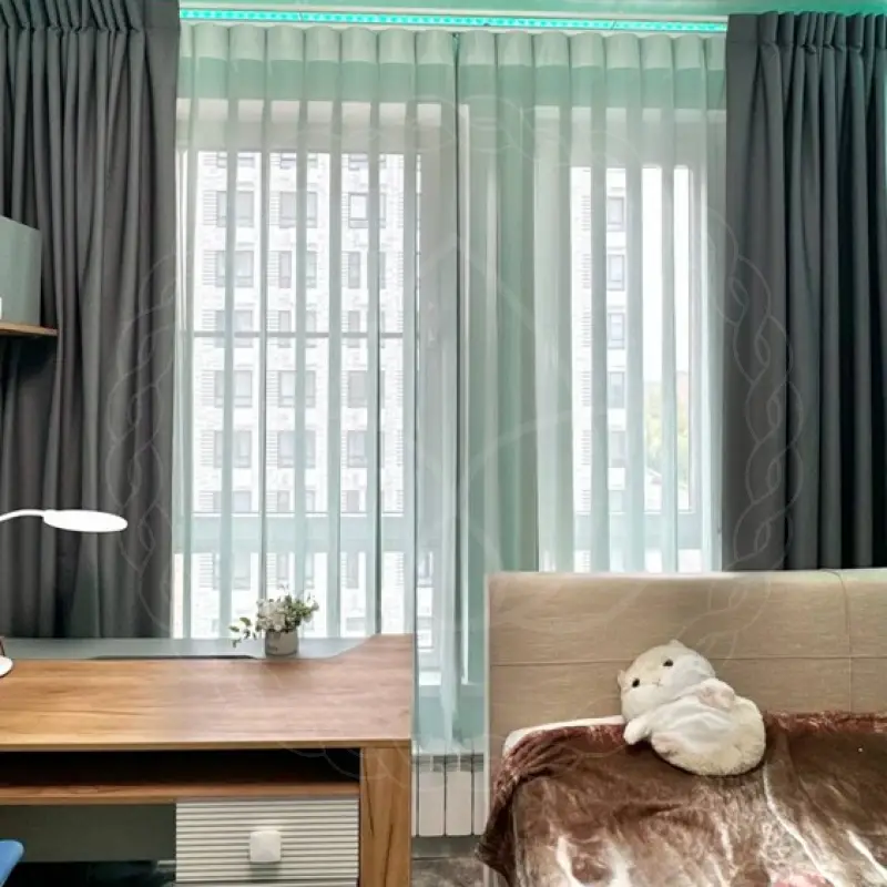 Шторные полотна отлично справляются со своими задачами. Они не только эстетически включаются в обстановку, но и прекрасно затемняют помещение и рассеивают избыточно яркий дневной свет. Пошив производился из синтетических тканей (100% полиэстера) — сетчатой и портьерной средней плотности. 290х270 сантиметров — размеры портьер в готовом виде. Под навеску смонтировали стеновой профильный карниз модели DS из окрашенного алюминия.
