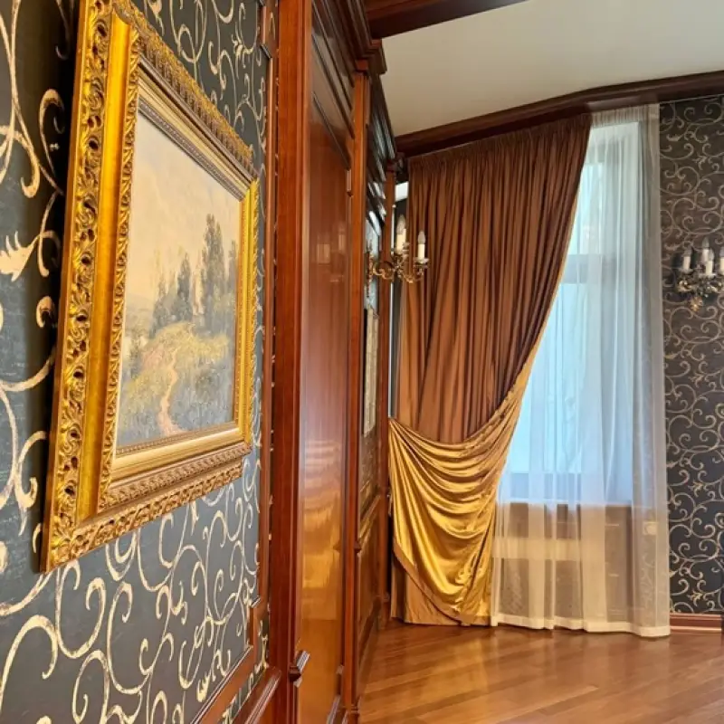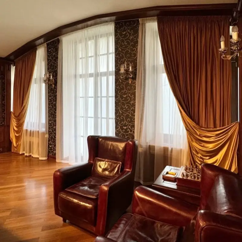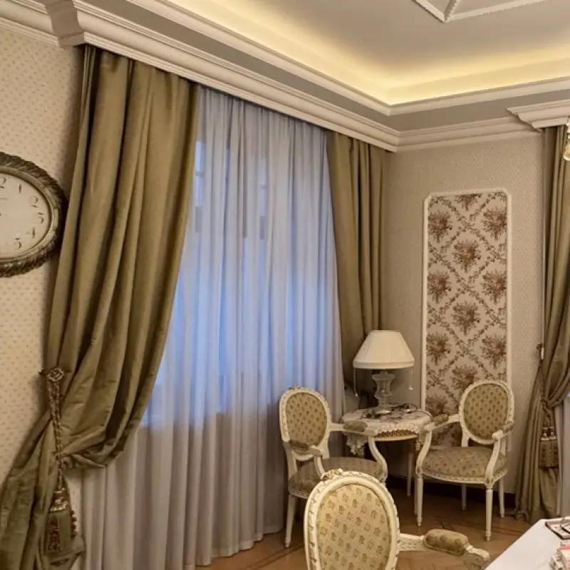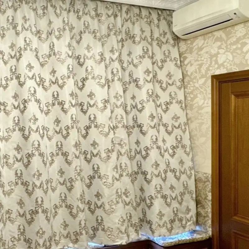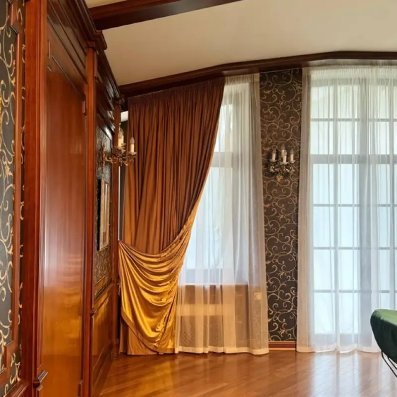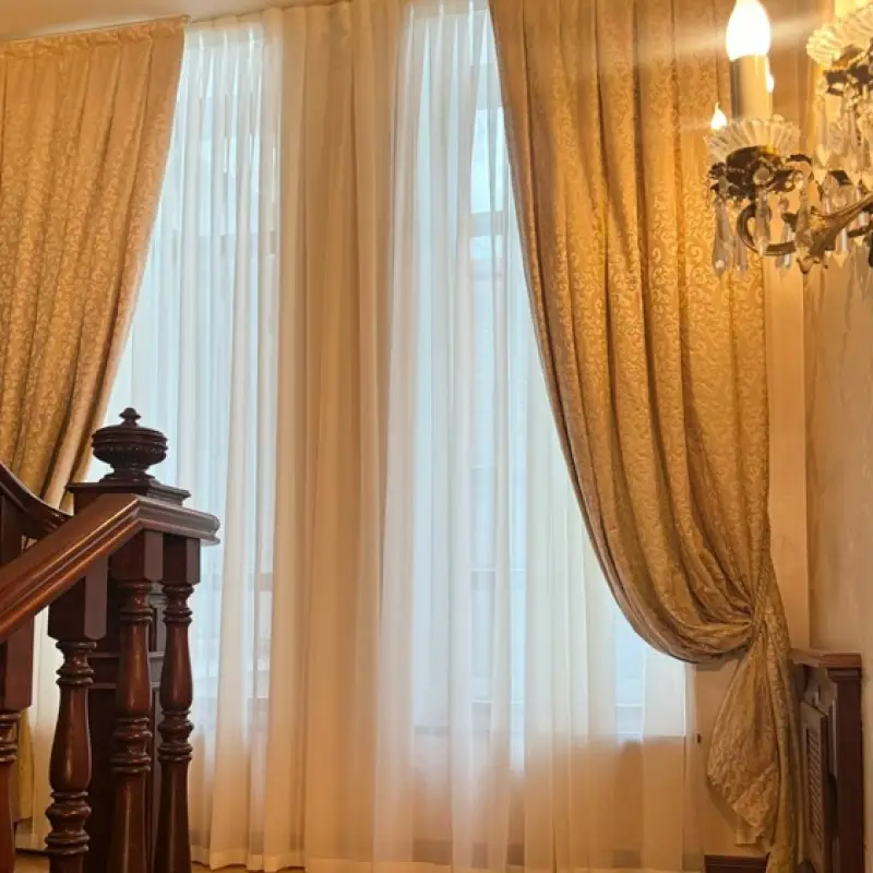 Занавеси размером 320х290 сантиметров были пошиты из полиэстеровых материалов — портьерной ткани средней толщины и вуали. Под навеску использовали декоративный карниз с круглой штангой и фигурными наконечниками на концах. Тип крепления — настенный.