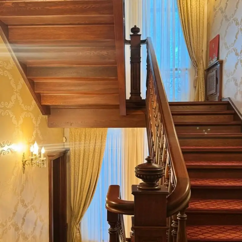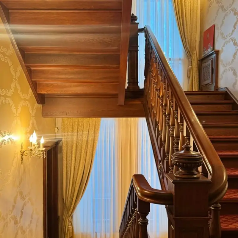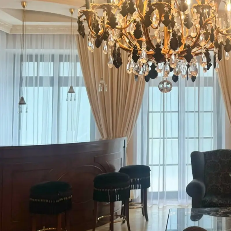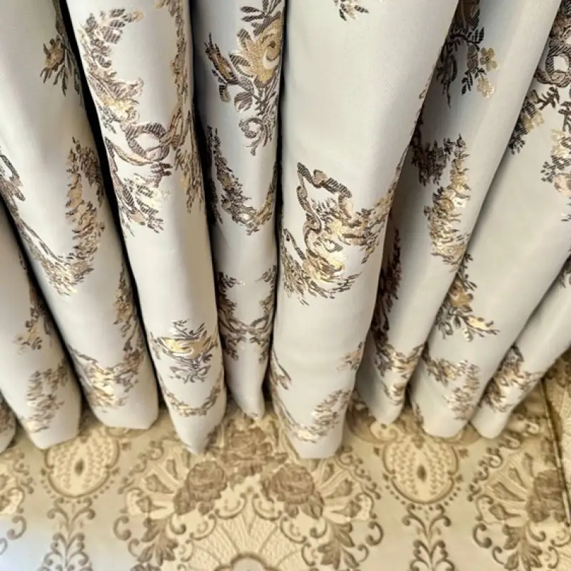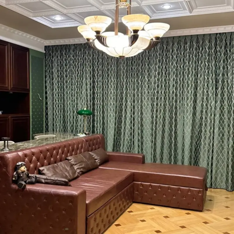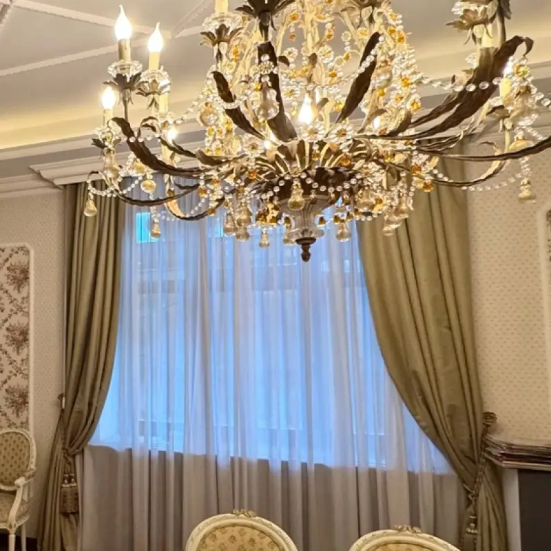 Занавеси размером 320х290 сантиметров были пошиты из полиэстеровых материалов — портьерной ткани средней толщины и вуали. Под навеску использовали декоративный карниз с круглой штангой и фигурными наконечниками на концах. Тип крепления — настенный.