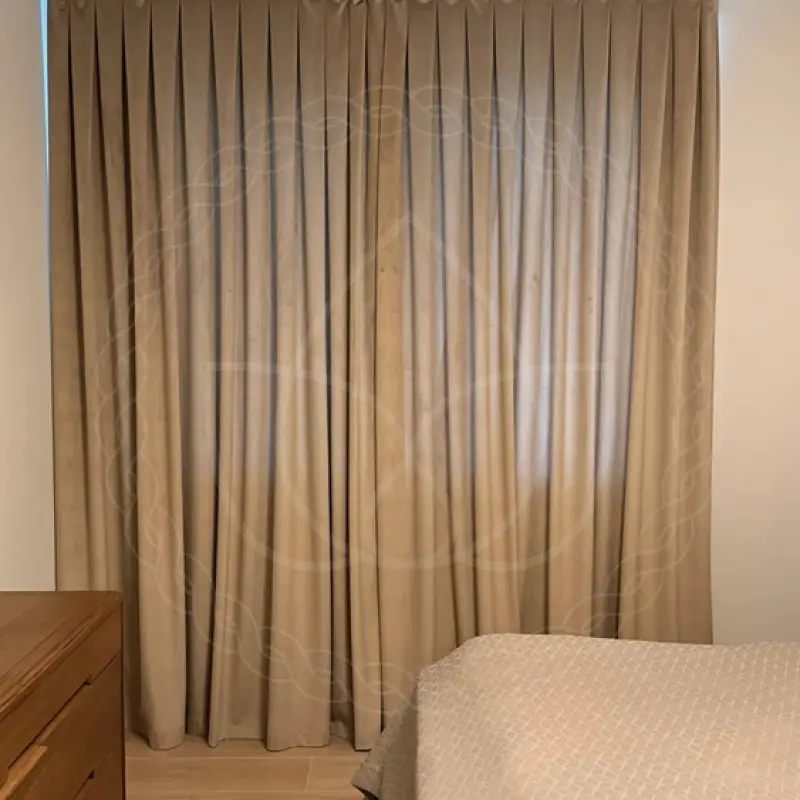 Для пошива подобрали ткани из полиэстера (100%) Это велюр и вуаль класса «стандарт». Размеры штор по длине и ширине составили 280х230 сантиметров. Под навеску наш мастер по монтажу установил декоративный круглый карниз с загибами для лучшего затемнения с настенной системой креплений.