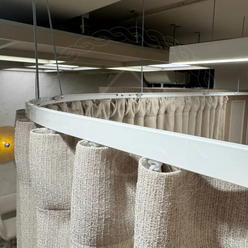 Размеры шторного полотна, пошитого из стопроцентного полиэстера, составляют 380х280 сантиметров. Материал относится к категории стандартных и отличается хорошей износостойкостью. Это важный момент для коммерческого помещения, где изделие подвержено активной эксплуатации. Под навеску был установлен изогнутый однорядный карниз из алюминиевого профиля на подвесных кронштейнах.