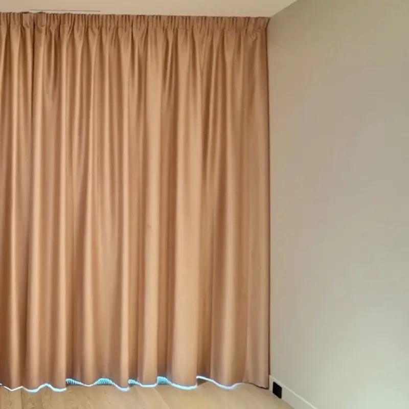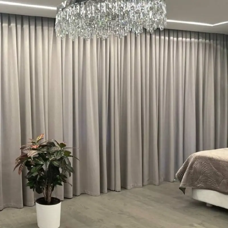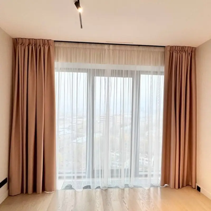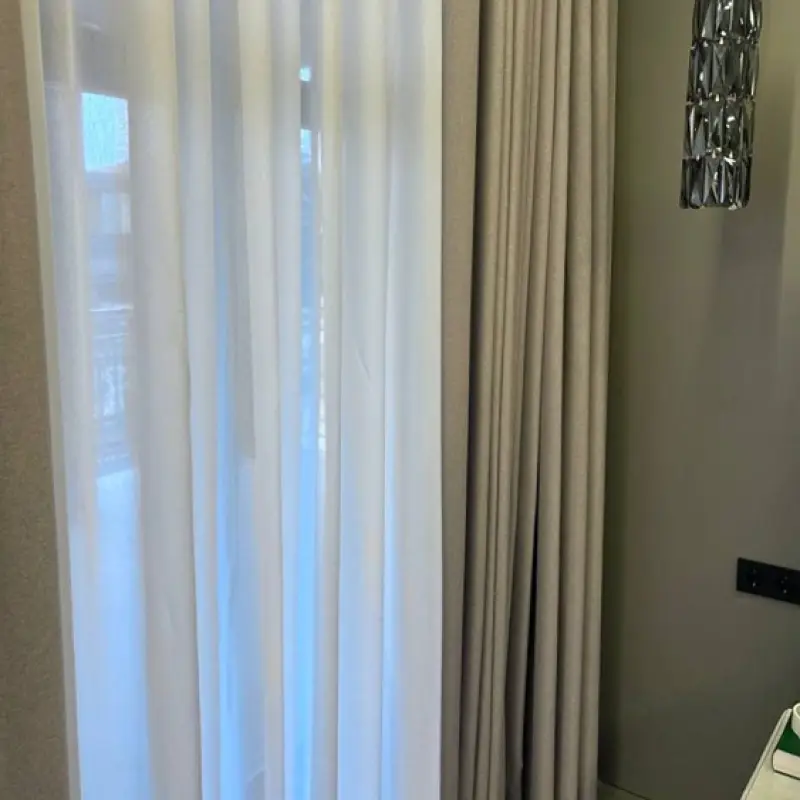 При пошиве использовали плотный димаут и вуаль из искусственных волокон (100% полиэстера). Полотно получилось довольно большим, так как портьеры закрывают практически всю стену. Размеры — 3,2х2,7 метра. Для навески был рекомендован профильный алюминиевый карниз под цвет тюля. Монтаж проводился мастером нашего салона.