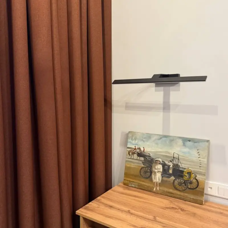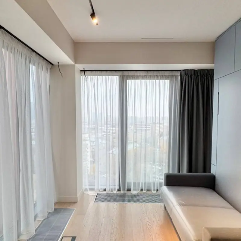 Проектом занималась наш дизайнер Алена. Изучив дизайн, произведя замеры и пообщавшись с заказчиком, она создала несколько визуализаций. Из них Елена с Дмитрием выбрали шторы из однородного димаута с тюлем вуалью.