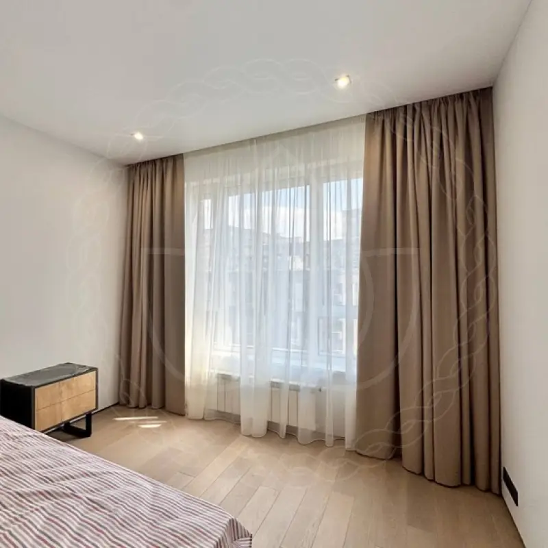 Чтобы создать нужную приватность и обеспечить затемнение для здорового сна, на пошив портьер был отобран димаут. Для тонких занавесок выбрали вуаль. Ткани состоят из стопроцентного полиэстера высокого качества, гарантирующего долгий срок службы изделий при правильном уходе за ними.