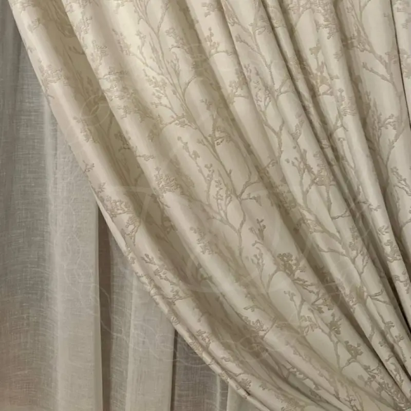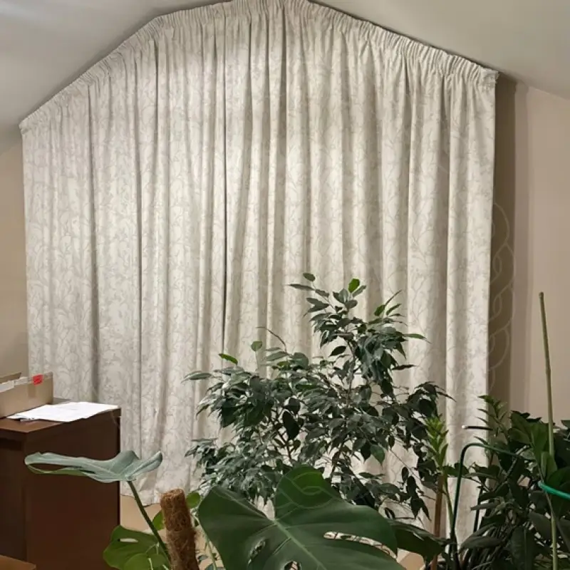 На пошив дизайнером были подобраны ткани категорий “премиум” и “стандарт” — жаккардовая и тюлевая. В их составе волокна стопроцентного полиэстера высокого качества. По размерам параметры штор получились следующими: 3.5 метра — ширина, 2.9 — длина. Под их навеску был установлен профильный карниз потолочного типа крепления с гнутием по форме окна.