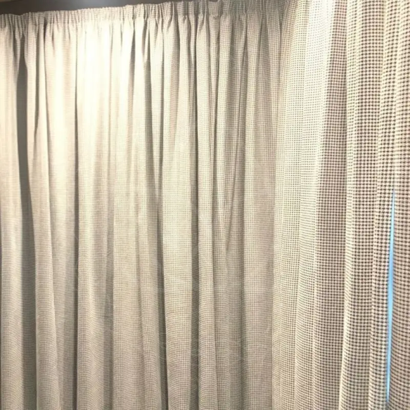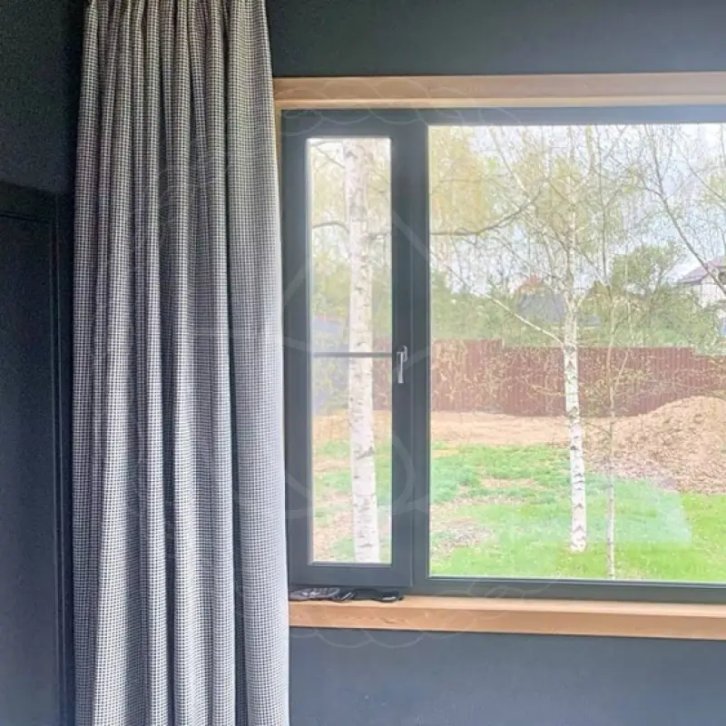 Пошив производился из жаккарда на подкладке из димаута (100% полиэстера) Такая комбинация позволяет при необходимости почти полностью блокировать внешнее освещение. За счет высококачественных синтетических волокон материя также устойчива к выцветанию и хорошо драпируется. Размеры шторных полотен на одно окошко — 3.5х2.9 метра. Под навеску был установлен стальной карниз с настенной системой креплений.