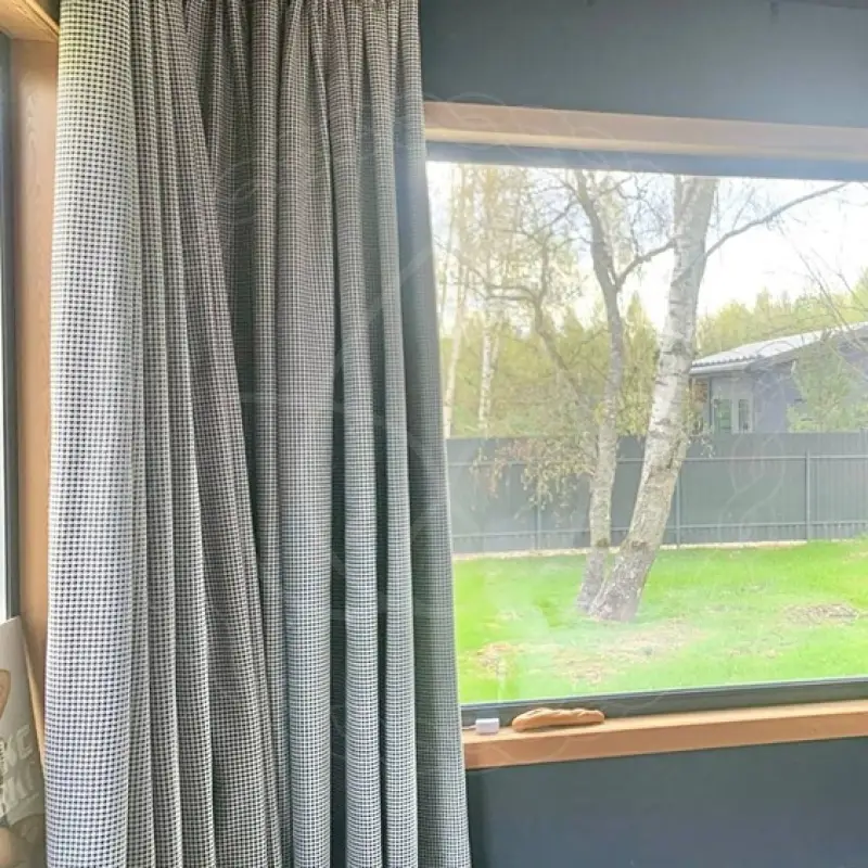 Оформлять окна в просторной кухне-гостиной решено было с помощью портьер с геометрическим рисунком “гусиная лапка” Принт очень эффектный, а контрастное сочетание темно- и светло-серого цветов придает ему еще большую выразительность, делая шторы ярким элементом интерьера в английском стиле. Добавлять в комплект тюль не стали по просьбе заказчиков, поскольку окошки выходят в сад, и рядом нет соседей. Так сохраняется не только естественное яркое освещение, но и красивый вид на пейзаж за окном.