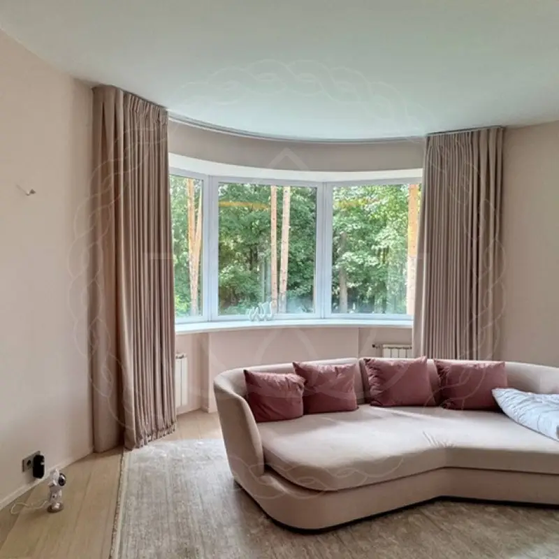 При пошиве мы использовали портьерную ткань средней плотности. Это шенилл из стопроцентного полиэстера. По размерам параметры изделия получились следующими: длина — 280 сантиметров, ширина — 350. Для навески портьер нашим мастером были установлены профильные однорядные карнизы — прямой и с радиусным гнутием.