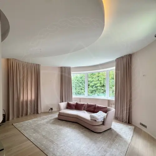 В просторной современной гостиной требовалось декорировать два окна — эркерное на скругленной стене и обычное на прямой. Хорошим вариантом для этого стали однотонные портьеры с напуском на пол из ткани нежного оттенка пыльной розы. Цвет чудесно оттеняет кремовые стены и диван, а также хорошо сочетается с напольным покрытием под светлое дерево с имитацией древесной текстуры.