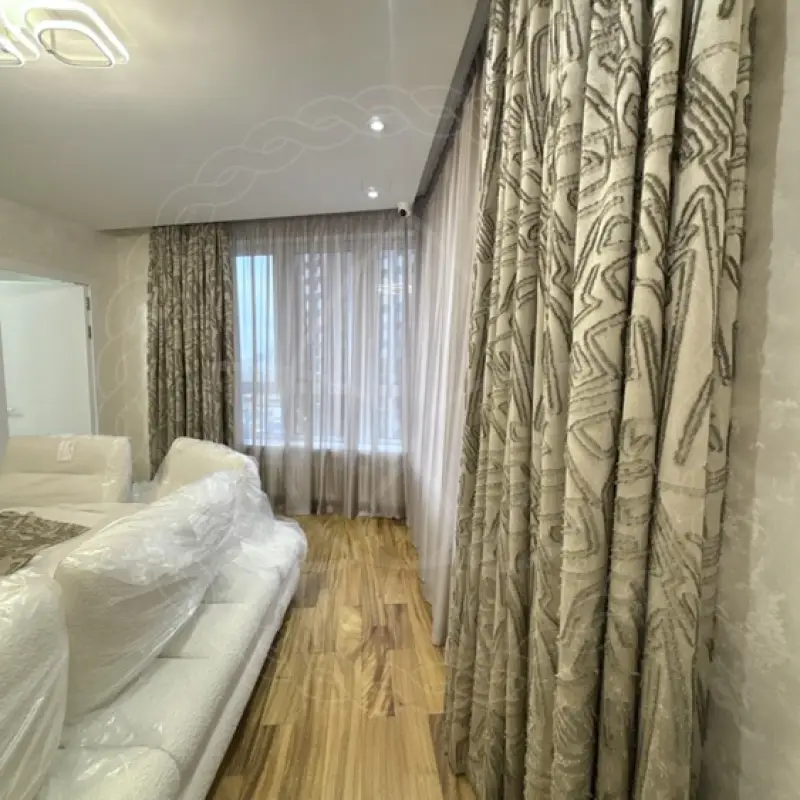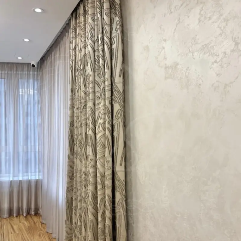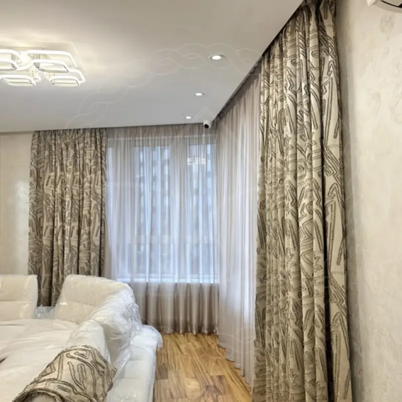 Шторы размерами 320х270 сантиметров были пошиты в пошивочном цехе нашего салона из высококачественной жаккардовой и тюлевой тканей. Обе они имеют в составе стопроцентный полиэстер, чьи свойства продлевают срок службы изделий, позволяя надолго сохранить эстетичный вид. Для навески внутрь специальной ниши были установлены профильные двухрядные карнизы. Все работы по монтажу, навешиванию и отпариванию были проведены специалистами нашего салона.