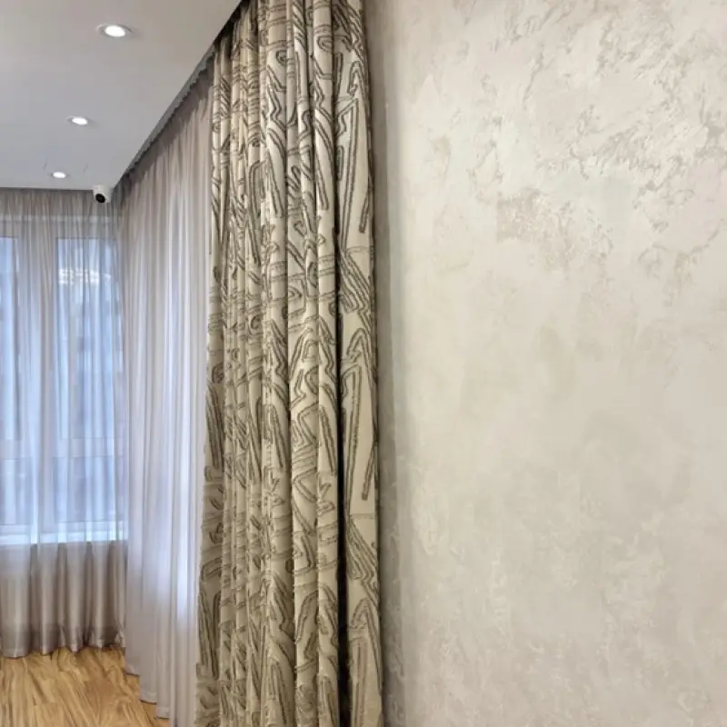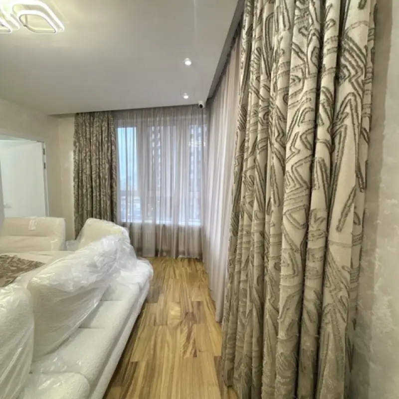 Материал, выбранный для пошива, состоит из стопроцентного полиэстера и относится к категории стандартных. Длина шторного полотна в готовом виде — 290 сантиметров, ширина — 320. Навеску проводили на однорядный эркерный карниз из алюминиевого профиля.