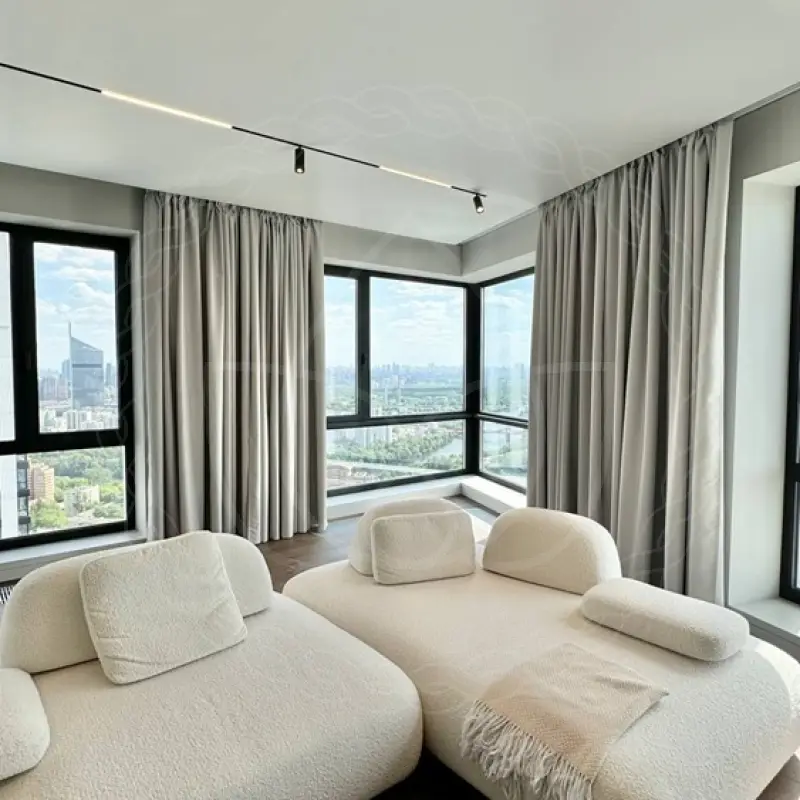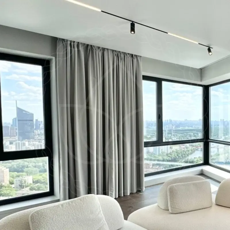 Для шитья использовали димаут из стопроцентного полиэстера. Материю отличает высокое качество и устойчивость к выцветанию, что крайне важно для окон, выходящих на солнечную сторону. Размеры одного комплекта штор составили 450х290 сантиметров. Под навеску в потолочные ниши были установлены однорядные карнизные профили из алюминия.