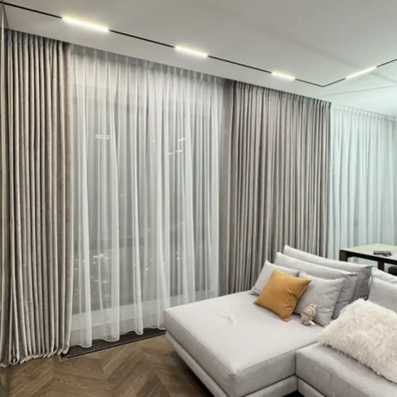 По размерам параметры получились следующими: длина — 280б ширина — 500 сантиметров. Для пошива были выбраны портьерная ткань средней плотности из полиэстера и микровуаль. Навеску выполнили на двухрядный карниз из алюминиевого профиля.