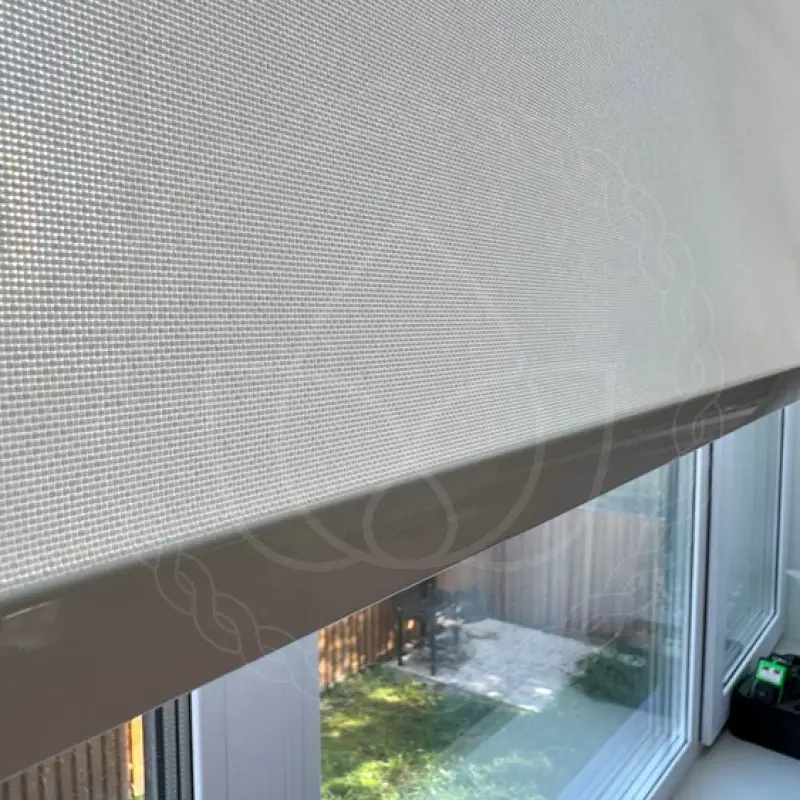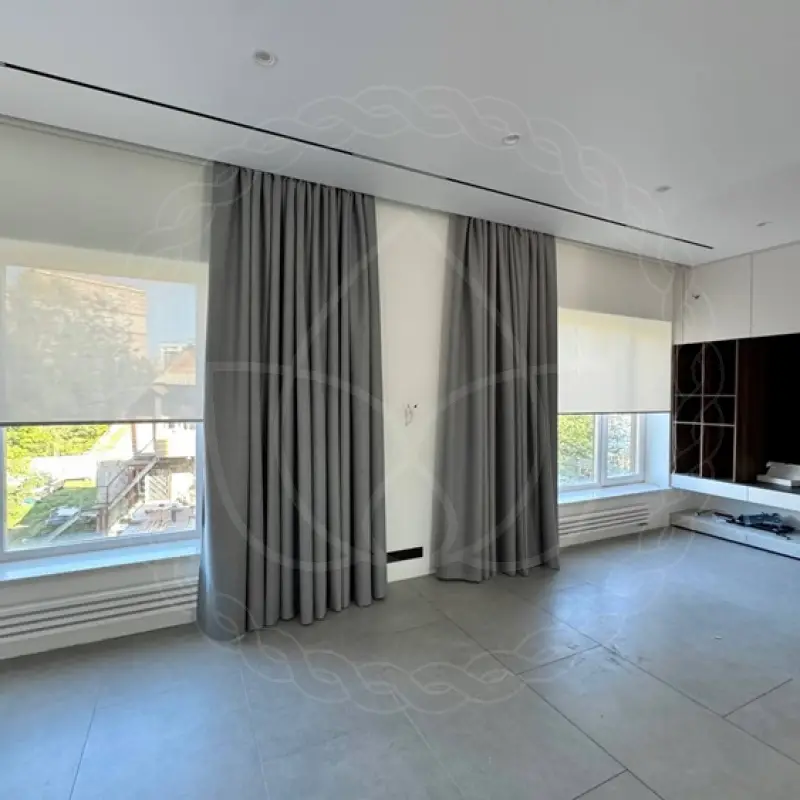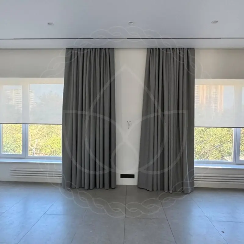 При пошиве использовались ткани категории “стандарт” — димаут и тюль. Обе материи имеют текстуру рогожки. В составе материалов волокна стопроцентного полиэстера. Длина одного полотна — 270 сантиметров, ширина — 290. Для навешивания были смонтированы две разновидности карнизных профилей — стандартный однорядный и с подъемным механизмом.