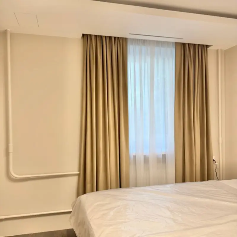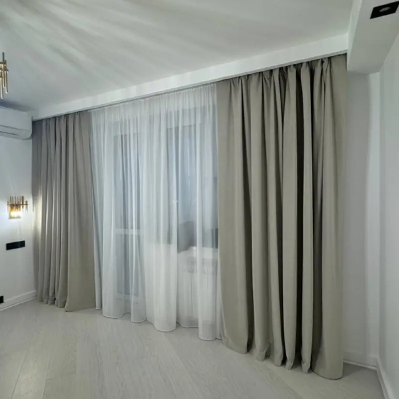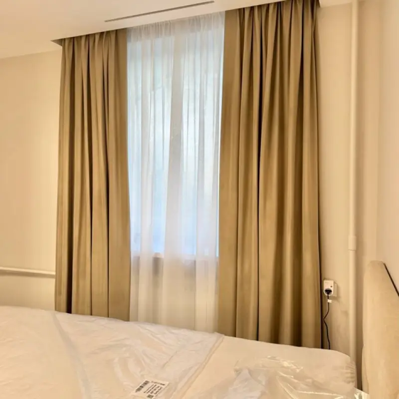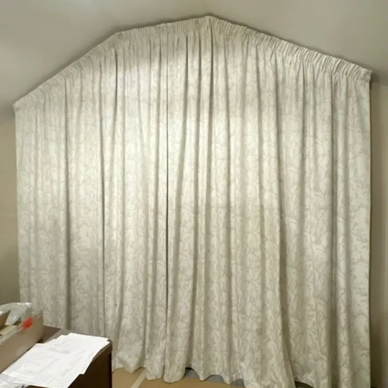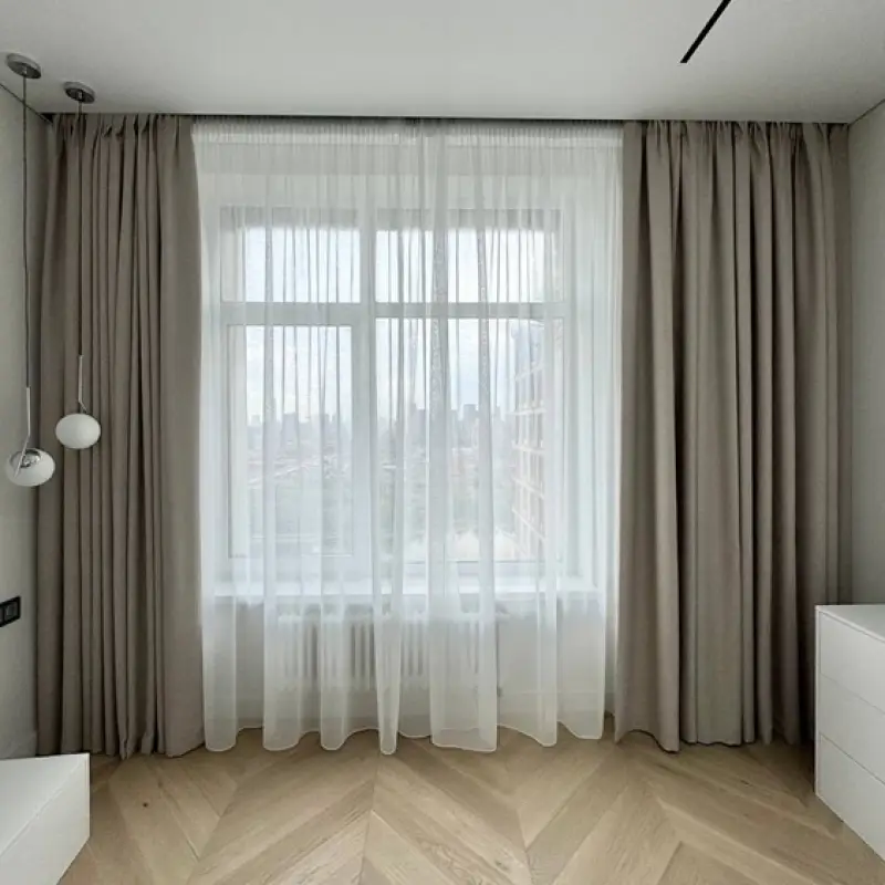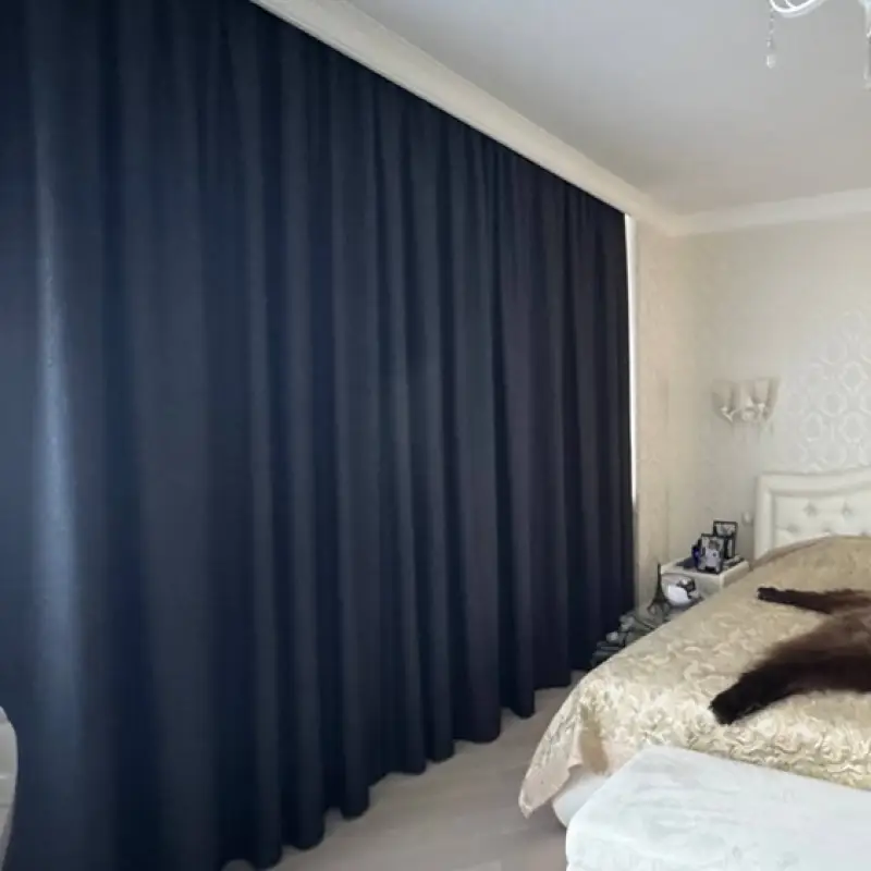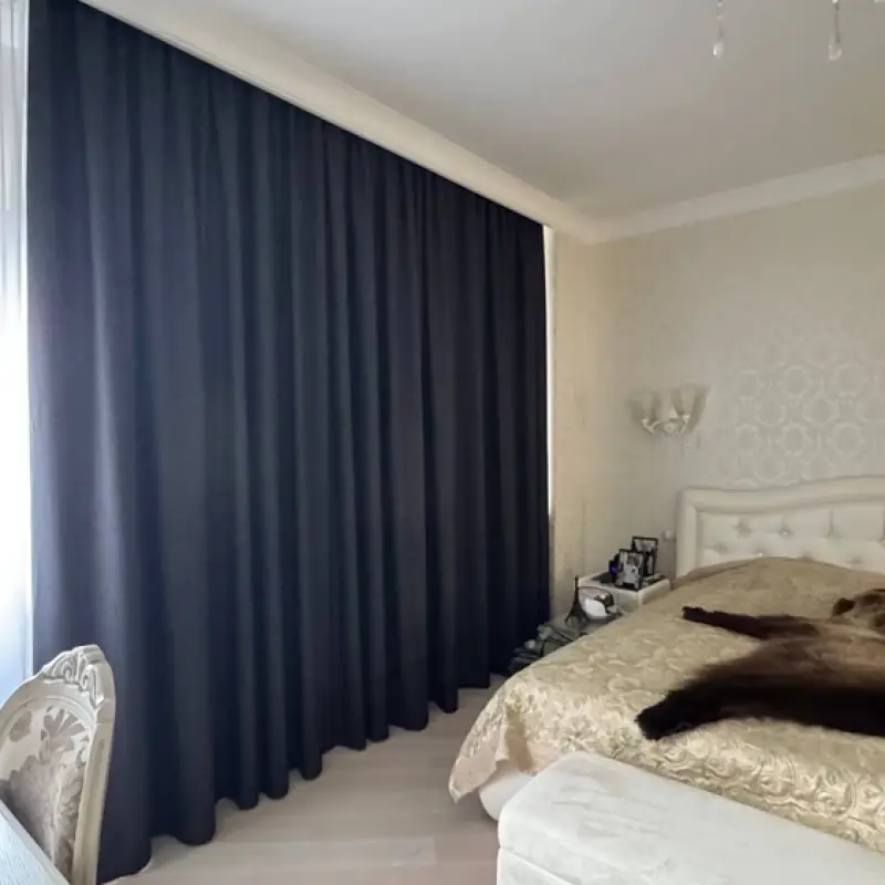 Для пошива мы подобрали стопроцентный полиэстер класса “стандарт”. Готовое шторное полотно имеет размеры 290х270 сантиметров и навешано на алюминиевый профильный карниз.