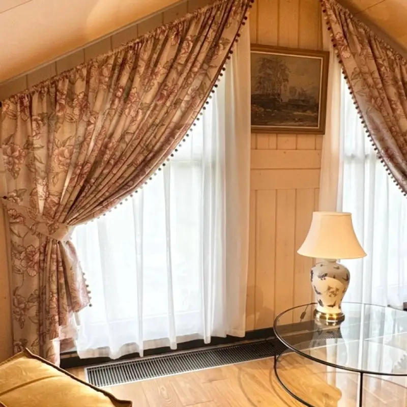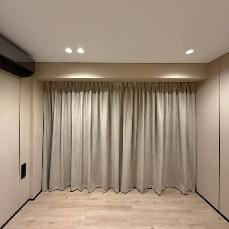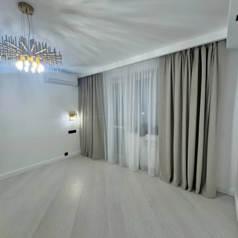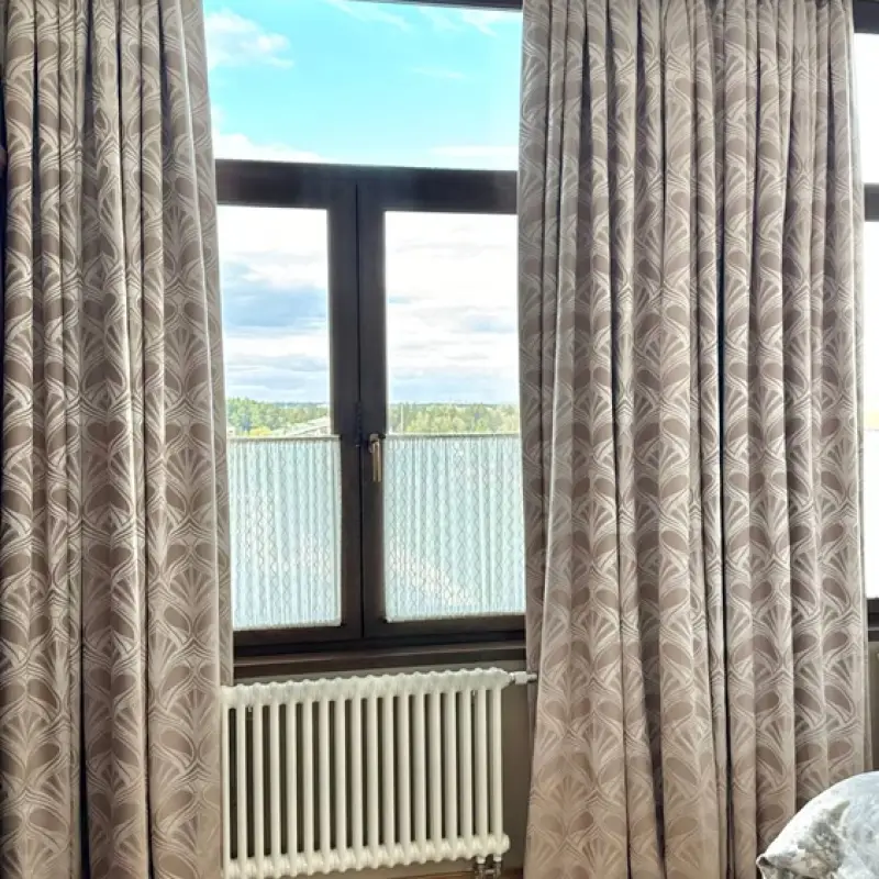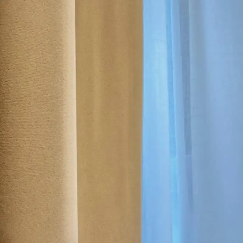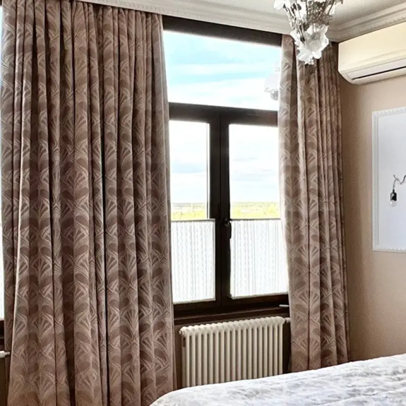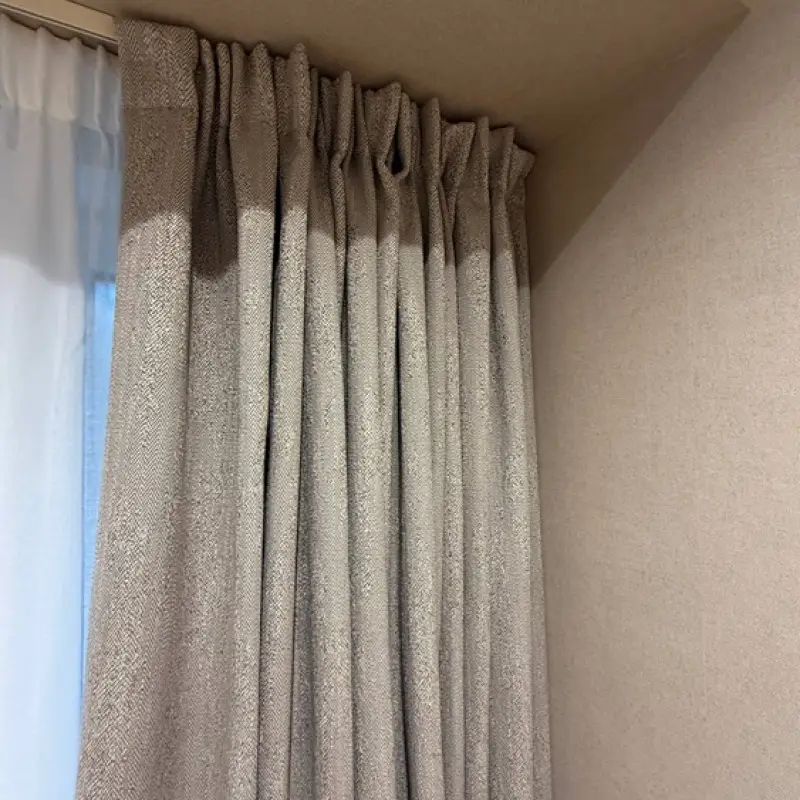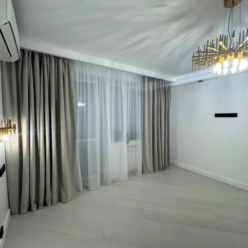 Для пошива мы подобрали стопроцентный полиэстер класса “стандарт”. Готовое шторное полотно имеет размеры 290х270 сантиметров и навешано на алюминиевый профильный карниз.