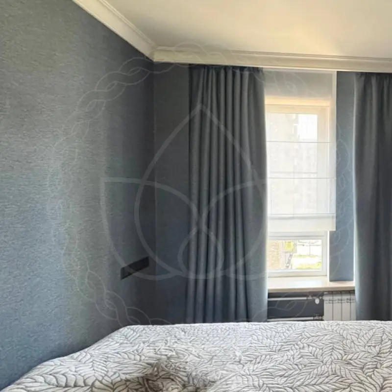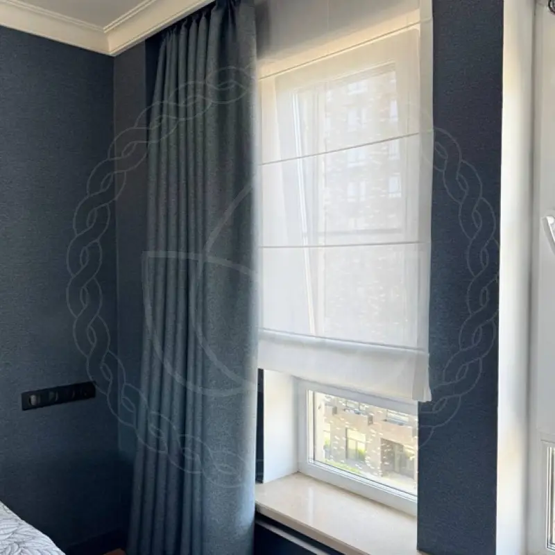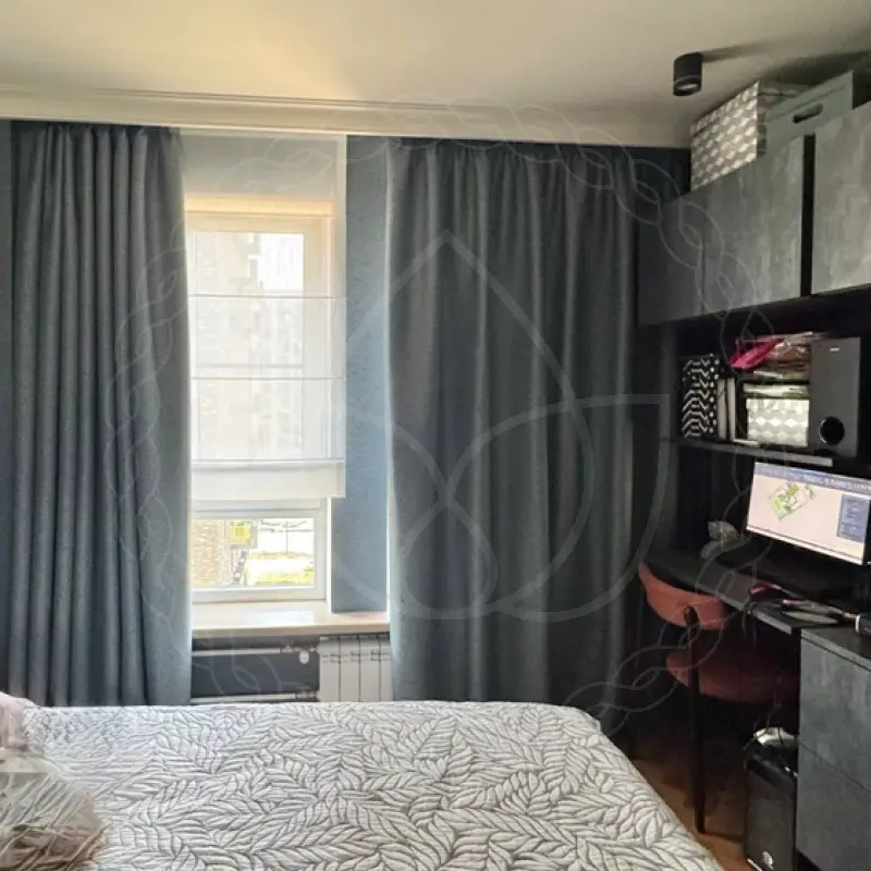 Гармонично включить шторные полотна в обстановку комнаты также помогают и правильно подобранные материалы и цвета. В этом проекте выбор был сделан в пользу жаккарда с подкладом из димаута и фактурным тюлем “под лен” Первый отлично затемняет помещение и гарантирует полную приватность и комфортный ночной сон, а второй чудесно справляется с рассеиванием яркого дневного света, что особо важно для окон, ориентированных на солнечную сторону.