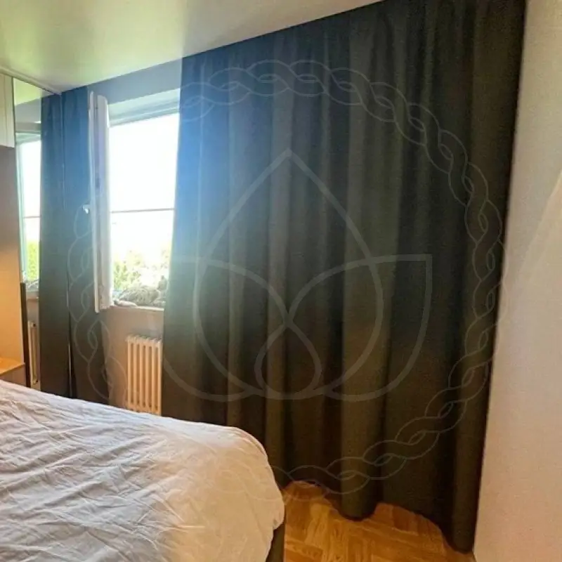 Окно в комнате выходит на восток, поэтому по утрам здесь очень много солнечного света. Это может провоцировать слишком раннее пробуждение, особенно когда световой день длинный. Поэтому хозяйка хотела эффективно затемнить комнату на время сна. Для этого мы предложили в качестве оконного декора портьеры из димаута, который блокирует порядка 70-80% внешнего освещения.