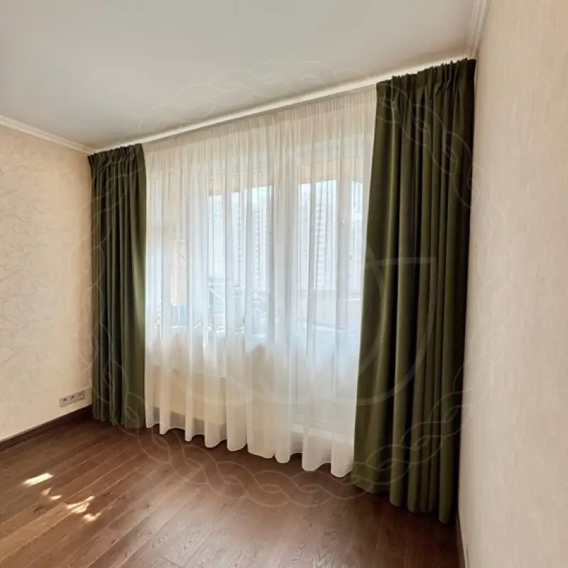 При пошиве мы использовали материалы из стопроцентного полиэстера премиальной категории качества. Велюр с беспальчиковым эффектом весьма практичен, поскольку на нем не остается следов. Матовая вуаль легко стирается, гладится и отлично держит форму складок. Итоговые размеры портьерных полотен составляют 320х280 сантиметров. Их навесили на зафиксированный нашим мастером потолочный профильный карниз из алюминиевого сплава.