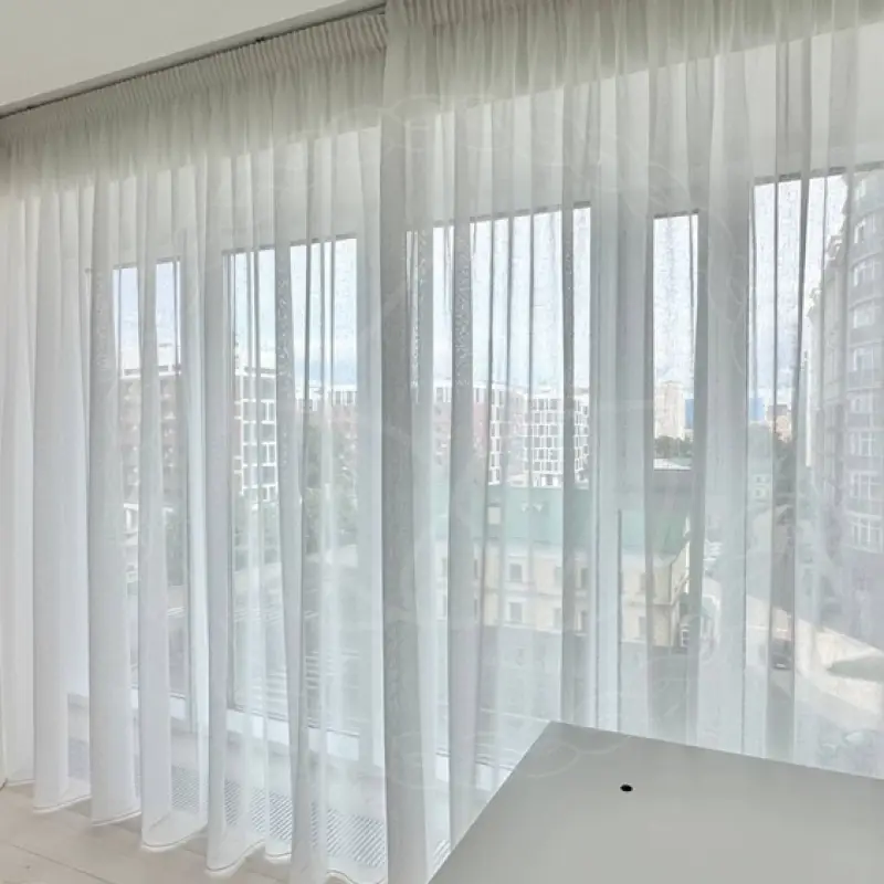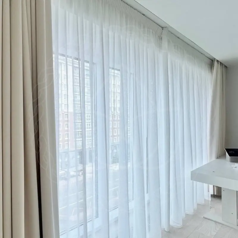 При пошиве мы использовали ткани с волокнами стопроцентного полиэстера в составе. Материалы относятся к категории стандартных и обладают хорошей воздухопроницаемостью, устойчивостью к накоплению пыли и низкой восприимчивостью к разрушительному воздействию ультрафиолета. Размеры занавесок в сантиметрах составляют 400х280 Установку профильного потолочного карниза с электроприводом (модель Air Motor 7000), навеску и отпаривание портьер проводил мастер нашей студии текстильного декора.