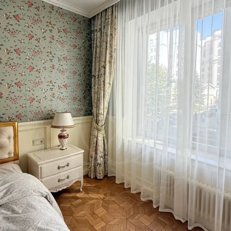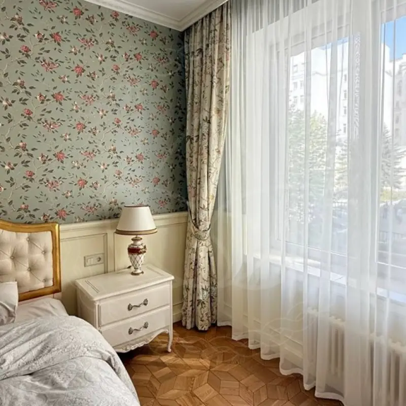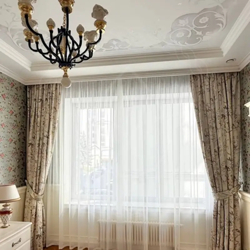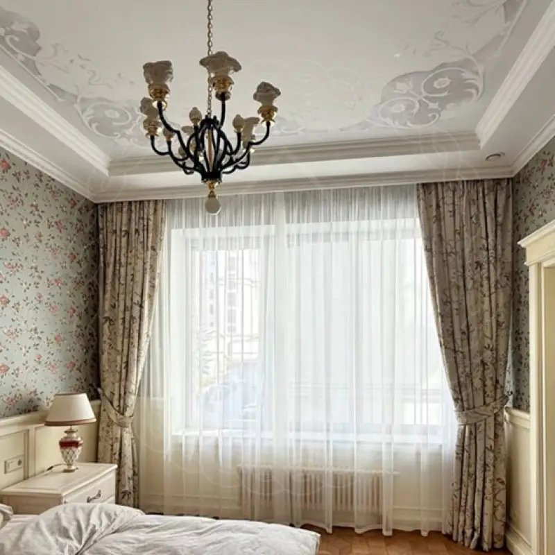 Для интерьера с обилием текстур декоратором были предложены классические легкие и плотные шторы. Материал для них подобрали под стать отделке — с нежным растительным принтом. Он не только перекликается с цветочным мотивом на обоях, но и хорошо сочетается с потолочным декором, напоминающим изысканные вензеля.