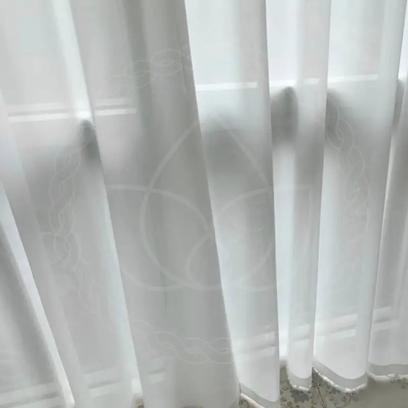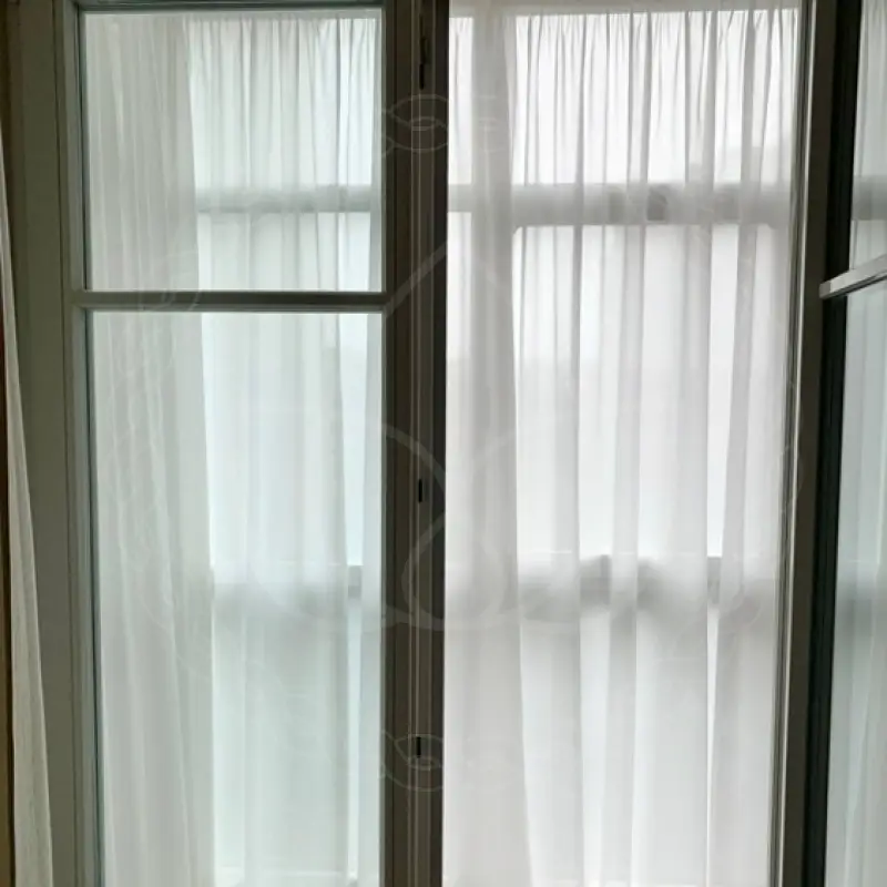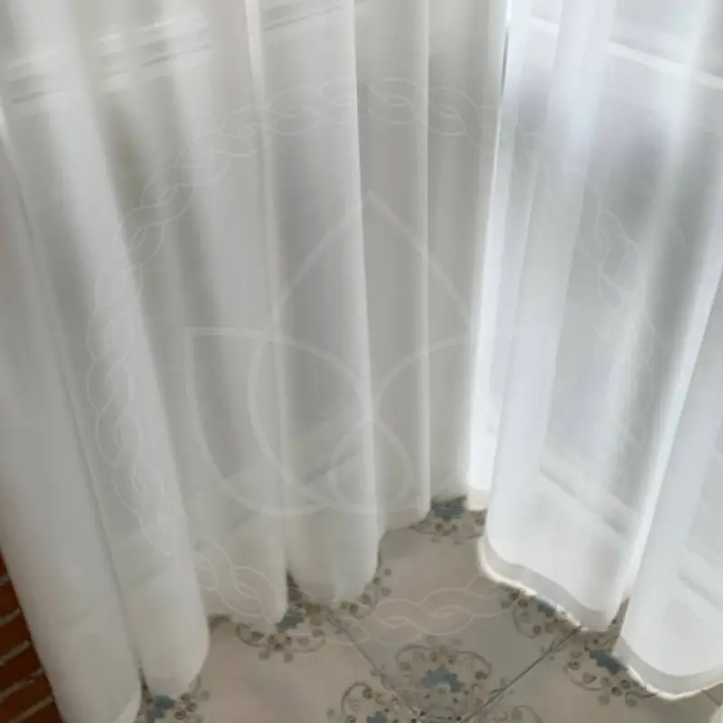 На пошив пошел тюль-креп из стопроцентного полиэстера премиальной категории качества. Шторные полотна размерами 3х2.8 метра закрепили на крючках профильного алюминиевого карниза.