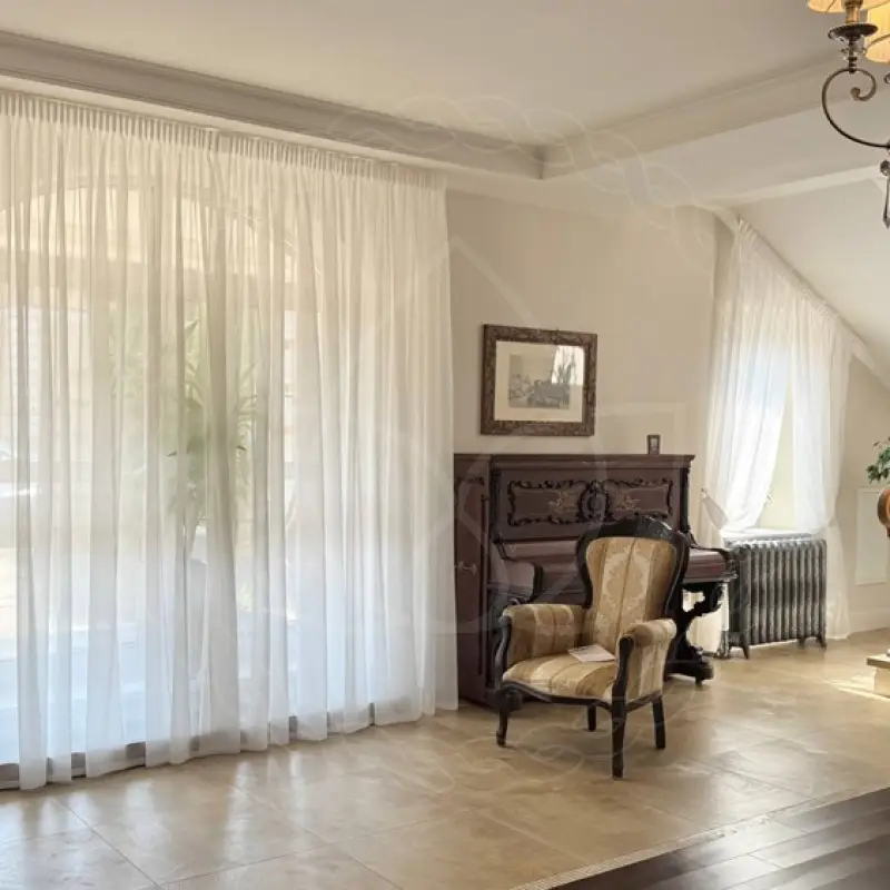 Гостиная просторная и светлая. Все окна выходят во двор и не видны соседям. Поэтому, чтобы сохранить вид на сад и хорошее освещение, мы предложили пошить оконный декор в виде тюлевых штор.