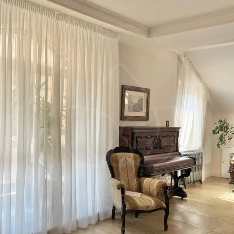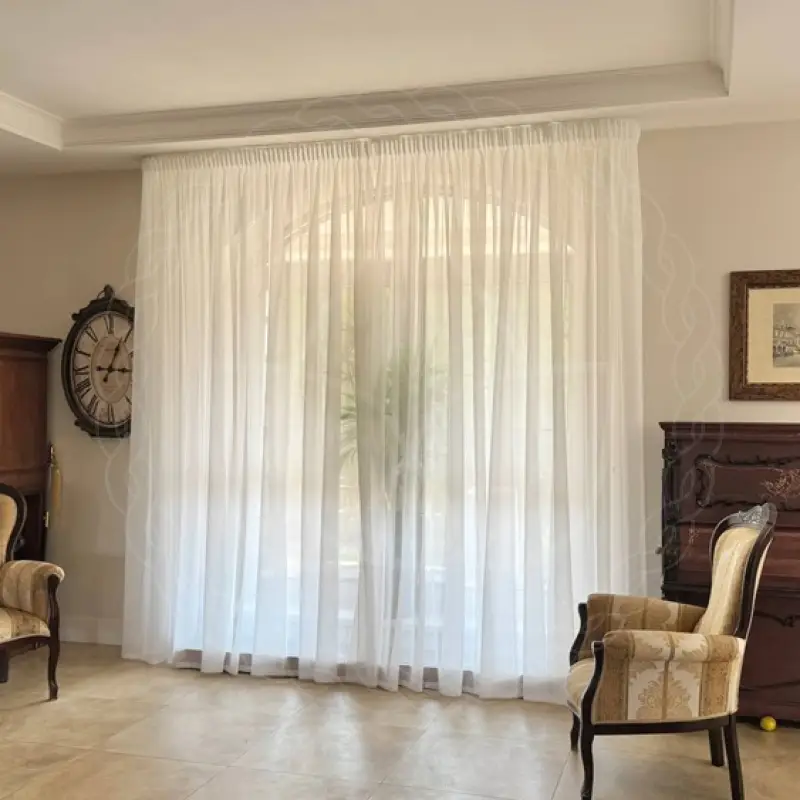 Пошив производился из стопроцентного полиэстера (тюль-сетка) высокого качества. Параметры готовых занавесок по длине и ширине — 280х270 сантиметров. Навеску штор и монтаж потолочного профильного карниза проводили сотрудники нашей студии текстильного декора.