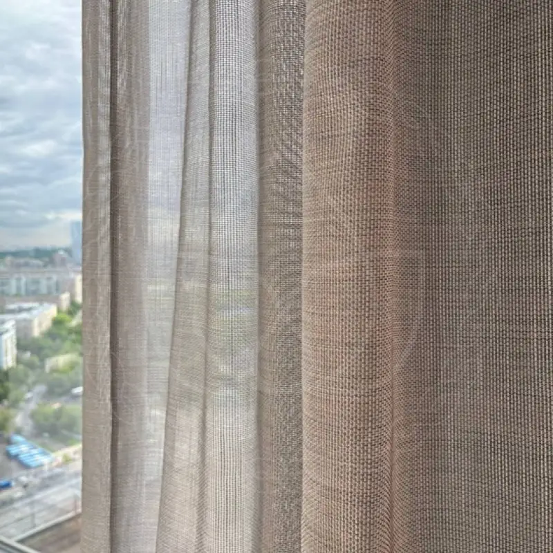 Тюль, за счет небольшой плотности и приятной текстуры “под хлопок”, позволяет дневному свету свободно проникать в комнату и в то же время рассеивает его, делает комфортным для глаз. Также большим плюсом такой модели занавесок является возможность любоваться прекрасным видом, открывающимся из окон с высоты, без постоянных перемещений шторного полотна.