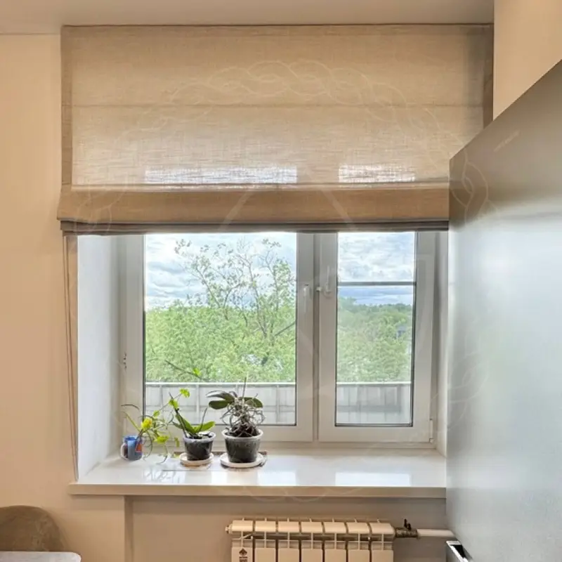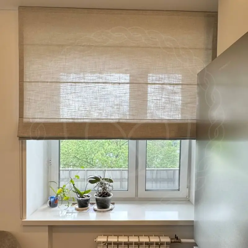 Практичная и компактная шторка очень хорошо вписалась в интерьер кухни и помогла сохранить легкий доступ к подоконнику, что важно для маленьких помещений. Полотно из тюля с рогожной фактурой оттенка кофе с молоком органично смотрится на фоне бледно-розовых стен и коричневого стола и кухонных тумб с древесной текстурой, мягко обрисовывая границы оконной зоны.