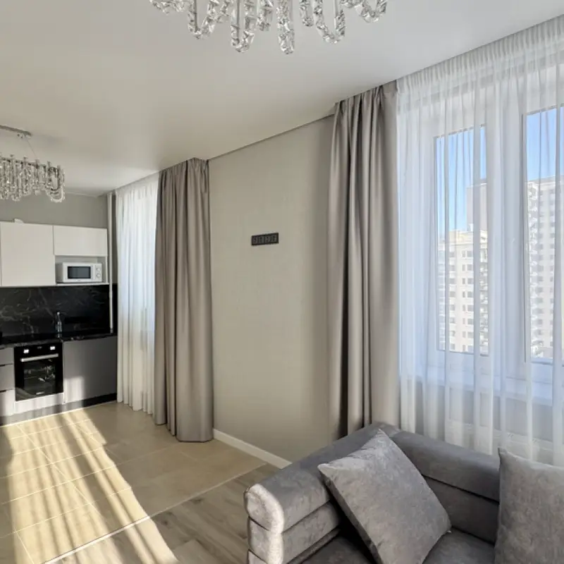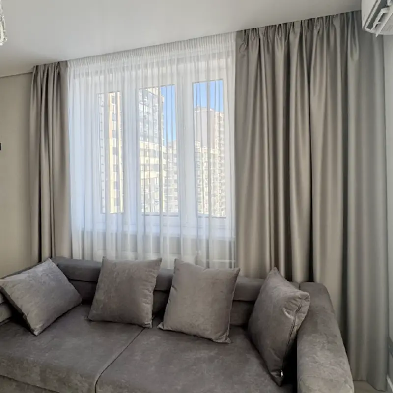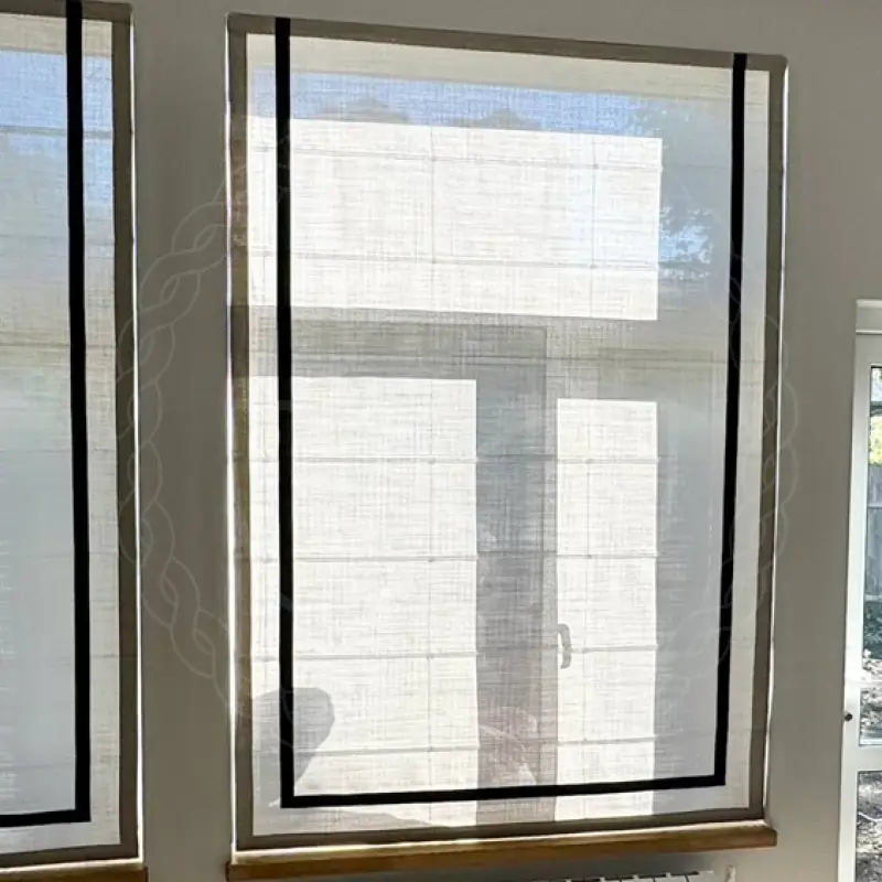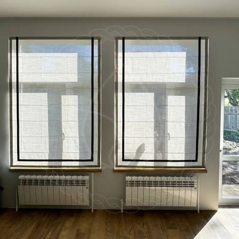 На пошив была отобрана ткань из полиэстера категории “стандарт” Она отлично выдерживает воздействие ультрафиолета и не вытягивается под собственным весом. Размеры римских штор составили 90х200 сантиметров. Для их навески мастером по монтажу был установлен карниз с классической подъемной системой.