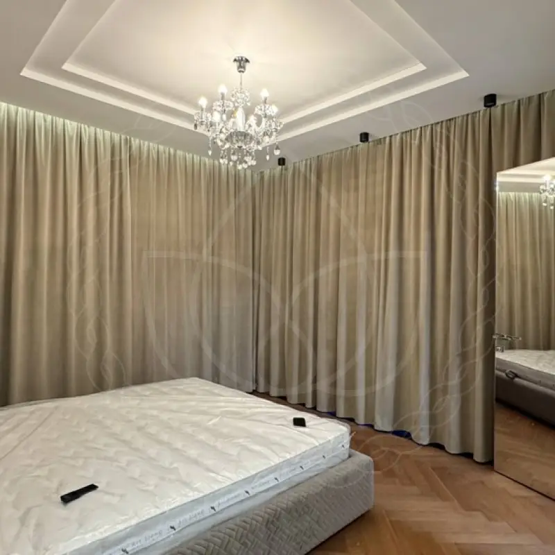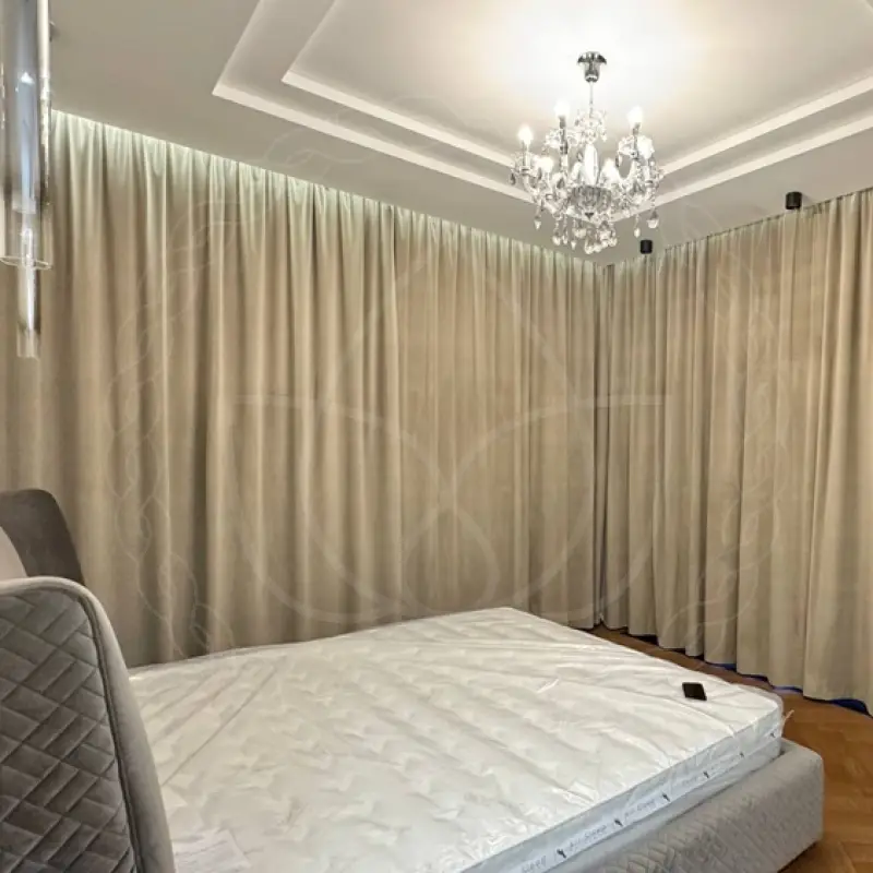Пошив изделий производился в нашем пошивочном цехе из стопроцентного полиэстера высокого качества (категория “стандарт”) Ширина готовых штор — 5.9, длина — 2.7 метра. Под навеску мастер по монтажу установил в нише на потолок профильный электрокарниз с эркерным изгибом. Это удобный и простой вариант для завешивания и отвешивания шторных полотен на высоких окошках.