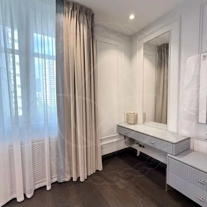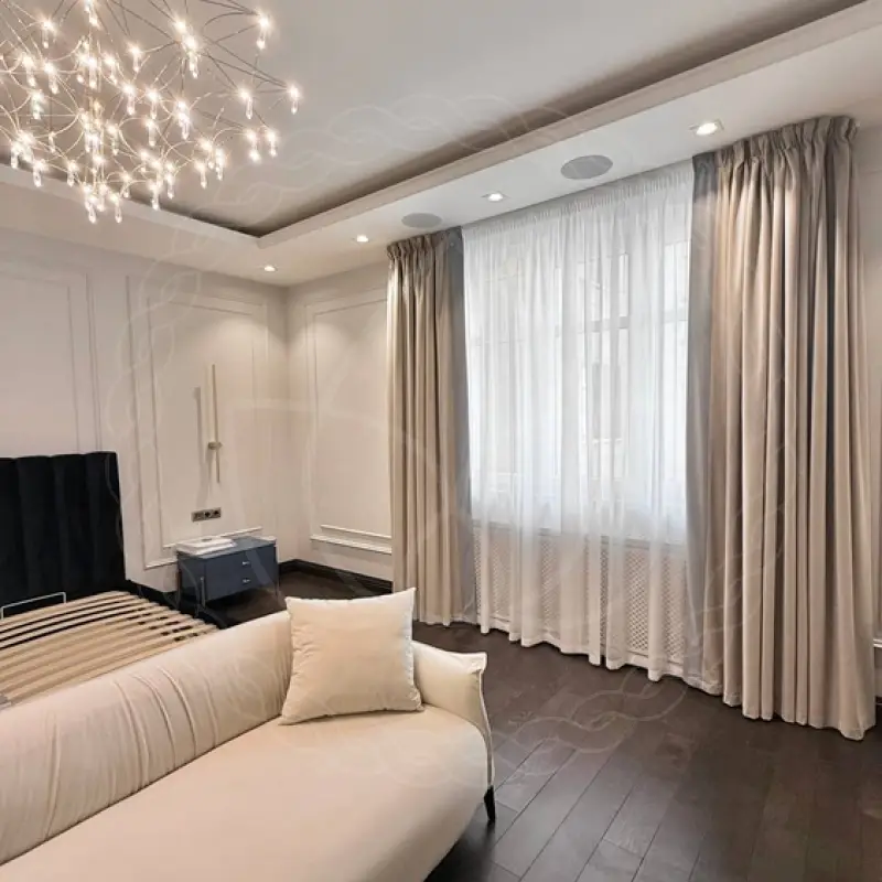 Для спальни с чертами неоклассики в оформлении мы предложили традиционные портьеры с тюлем. В качестве материала из предложенных вариантов хозяева предпочли велюр. Он имеет приятную фактуру с небольшим ворсом и прекрасно подходит для создания уютных интерьеров.
