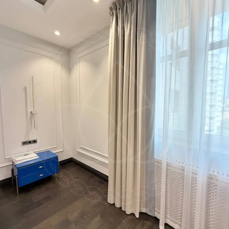 Для пошива использовался стопроцентный полиэстер (велюр, органза) Параметры занавесей — 300х270 сантиметров. Они были навешены на потолочный двухрядный карниз из алюминиевого профиля.