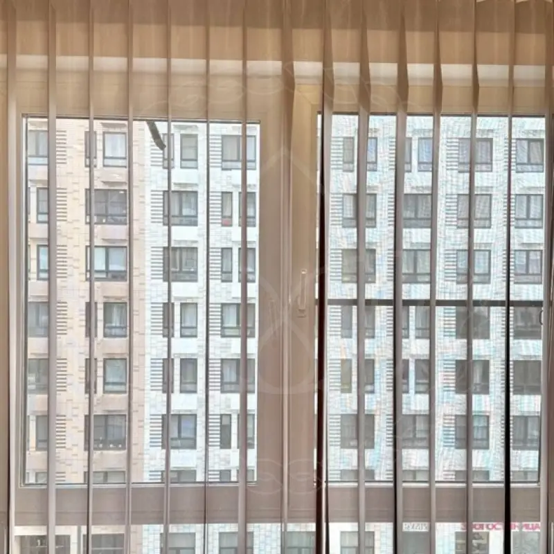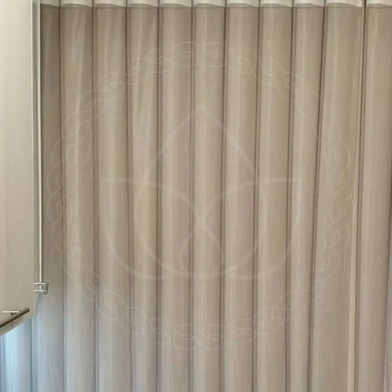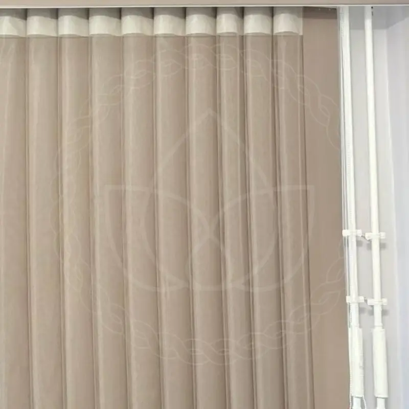 Для кухни тканевая система “Вальс” подошла прекрасно не только благодаря практичности, но и за счет эстетичного дизайна. Это не классический вариант для офисных помещений. В нем задействованы плотные тканые ламели с тюлевыми вставками, которые придают шторке уютный и элегантный вид. При этом регулировать освещенность и уровень приватности с ней также просто, как и с обыкновенными жалюзи. Каждый элемент отделен от остальных, но в определенном положении стыков между ними не видно. Поэтому создается эффект однородного полотна с множеством волнообразных складок.