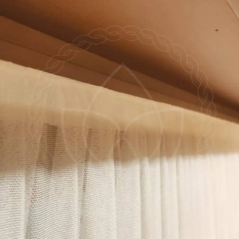 Для пошива использовалась синтетическая ткань из стопроцентного полиэстера. Размеры изделия нестандартные — 90х200 сантиметров. Крепеж производился на мини-карниз с тонкой металлической штангой.