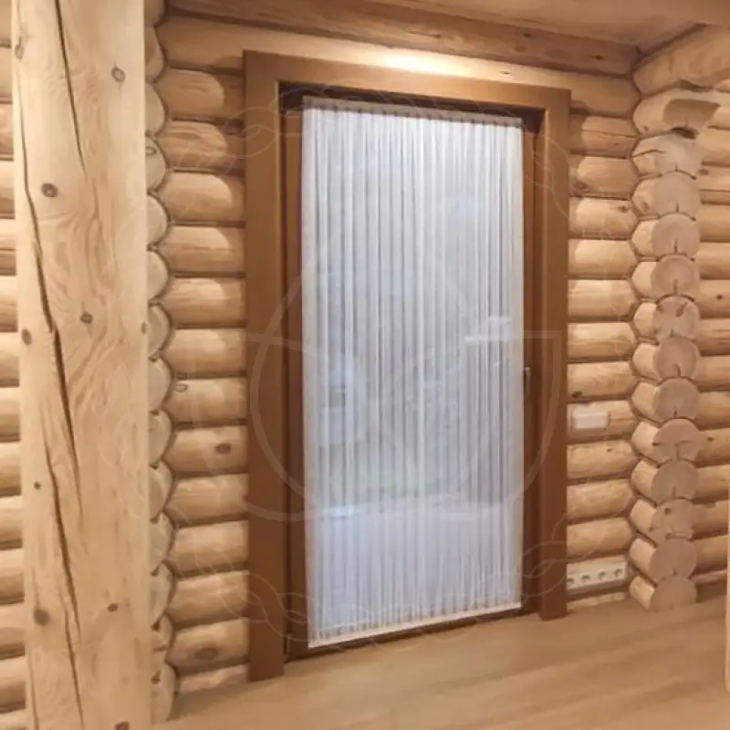Материал штор-кафе легкий и хорошо рассеивает яркий солнечный свет, в то же время давая нужный уровень приватности. Деликатные аккуратные складки воздушного полотна смягчают массивные стены из натурального дерева и привносят уют в обстановку зала вместе с основными портьерами.