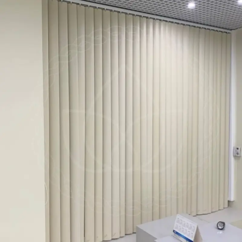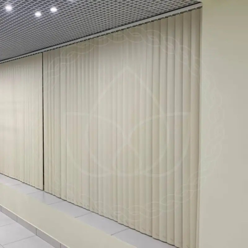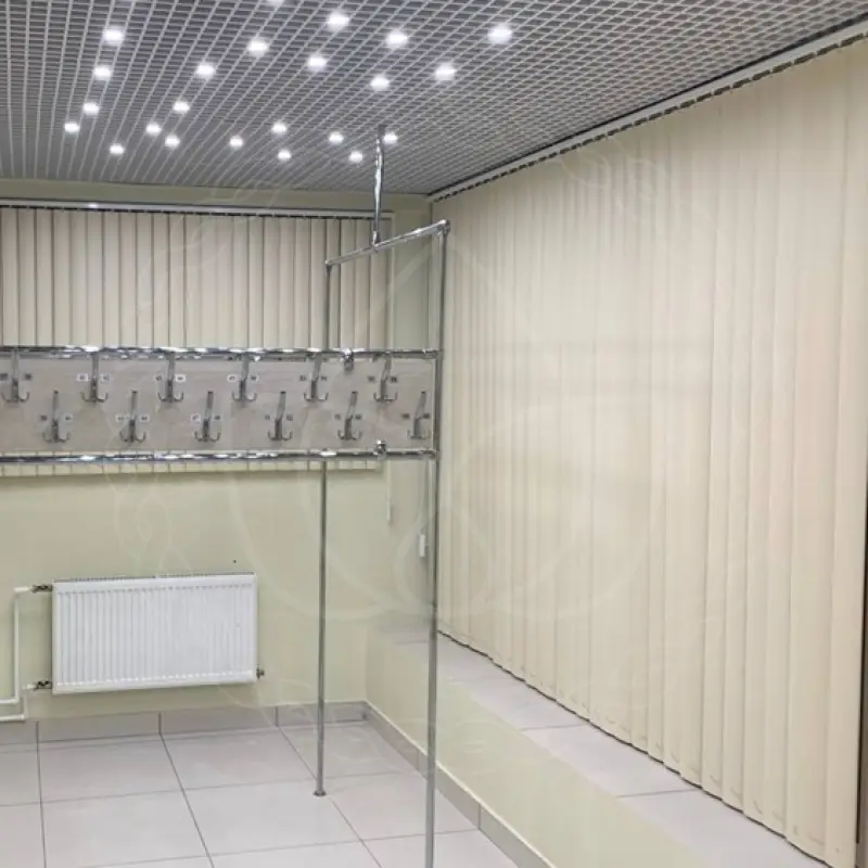 Ламели довольно широкие и изготовлены из однотонного бежевого пластика, хорошо подходящего под окрашенные бледно-желтой краской стены и белые стеклопакеты. Беж — нейтральный оттенок, поэтому прекрасно смотрится в лаконичном оформлении гардеробной комнаты. Материал очень прост в уходе. Достаточно периодически протирать его влажной тряпочкой или пылесосить, используя насадку в виде мягкой щетки. При этом пластиковые панели отличаются долгим сроком службы, а также отлично выдерживают разрушительное воздействие ультрафиолета и неплохо блокируют прямой солнечный свет.